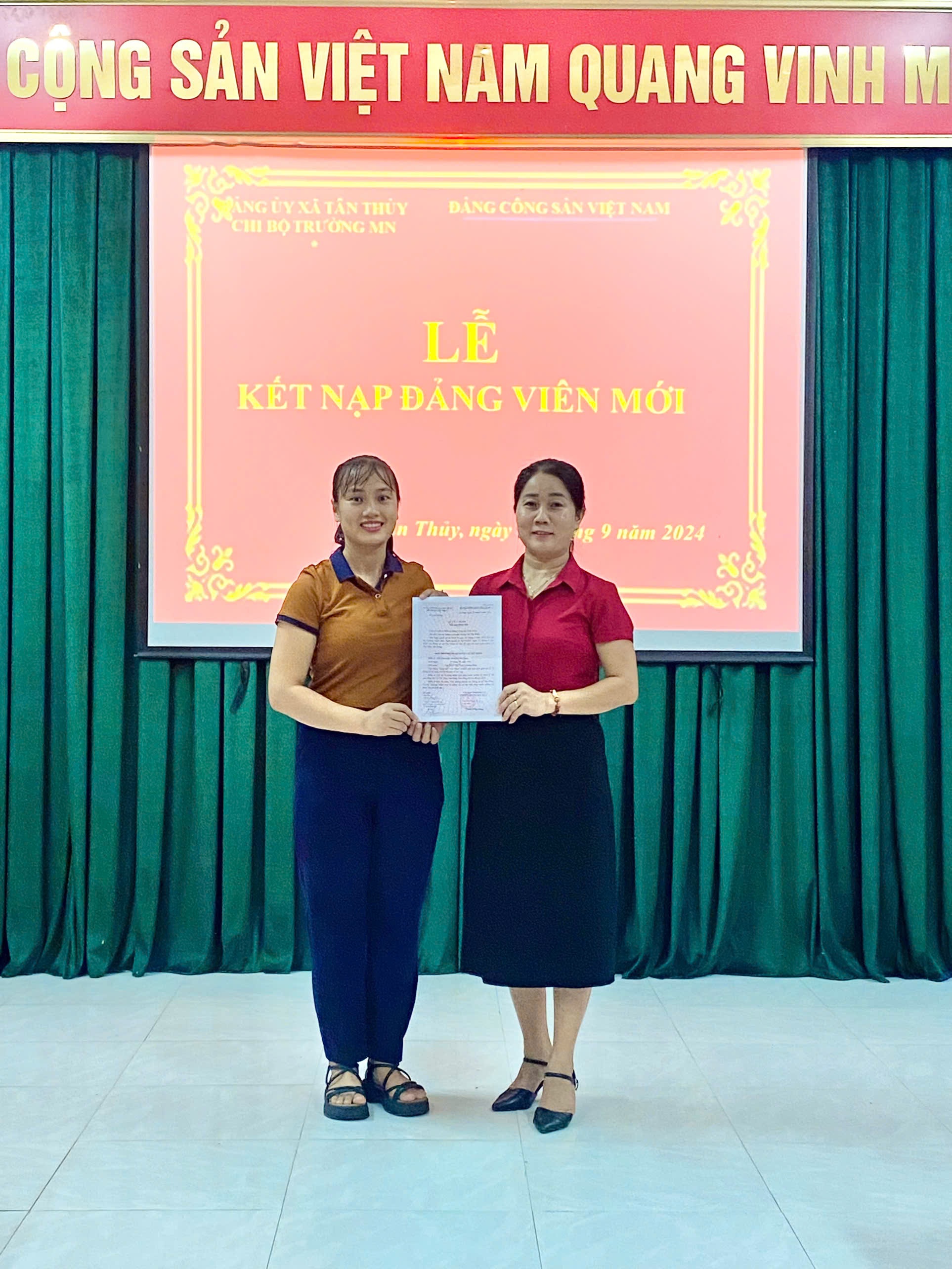 Thực hiện Nghị quyết Đại hội Chi bộ Trường Nầm Non TânThủy về việc phát triển Đảng viên. Ngày 05/9/2024, Chi bộ Trường Mầm Non Tân Thủy đã long trọng tổ chức lễ kết nạp Đảng viên mới đối với quần chúng ưu tú: Lê Thị Thúy. Đây là sự kiện có ý nghĩa quan trọng trong công tác xây dựng Đảng, góp phần phát triển, nâng cao chất lượng và sức chiến đấu của Chi bộ trường nói chung và các cá nhân Đảng viên nói riêng.